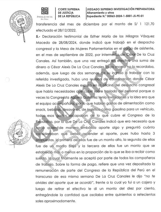 Entre sus argumentos para ordenar el allanamiento a los inmuebles vinculados a la perulibrista, el juez supremo Juan Carlos Checkley remarcó que los elementos de convicción, entre ellos dos informes de la UIF (que detallan las transferencias a favor de De la Cruz y Flores Valencia) y las declaraciones descritas líneas arriba, “reflejan que existen motivos razonables” de que Agüero “en su condición de congresista habría recaudado cobros indebidos a trabajadores” del Parlamento.