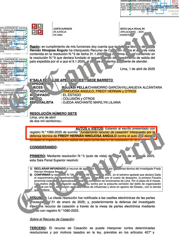 Según el documento al que accedió El Comercio, Fredy Hinojosa y su defensa legal han cuestionado que el juzgado y la sala de apelaciones hayan considerado la existencia de una “sospecha” o motivos que concluyan que habría cometido los delitos que se le imputan.