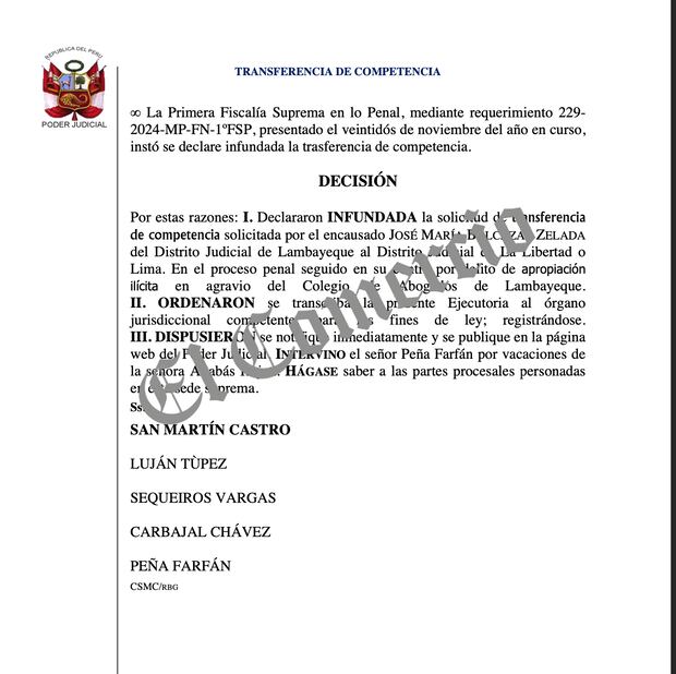 También desestimó el argumento de Balcázar según el cual se buscaría dictar una condena arbitraria teniendo como base las relaciones institucionales entre la fiscalía y el Poder Judicial con el Colegio de Abogados de Lambayeque.