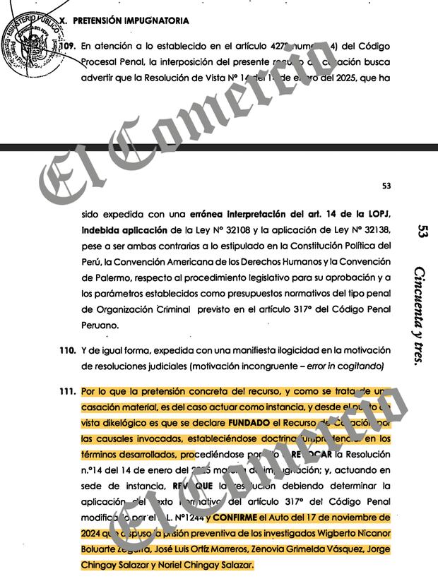 “Es menester indicar, que la finalidad del presente recurso además de restituir la Prisión Preventiva dictada en contra los investigados Wigberto Nicanor Boluarte Zegarra, Jorge Luis Ortiz Marreros, Zenovia Griselda Herrera Vásquez, Jorge Chingay Solazar y Noriel Chingay Solazar, es que la Corte Suprema de Justicia, emita doctrina jurisprudencial”