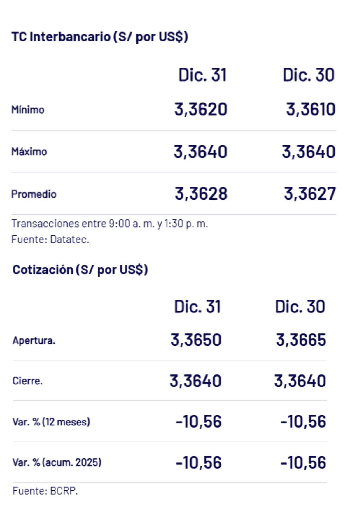 El tipo de cambio interbancario cerró el 31 de diciembre del 2025 con un valor promedio de 3,3628, con un máximo de 3,3640 y un mínimo de 3,3620.
